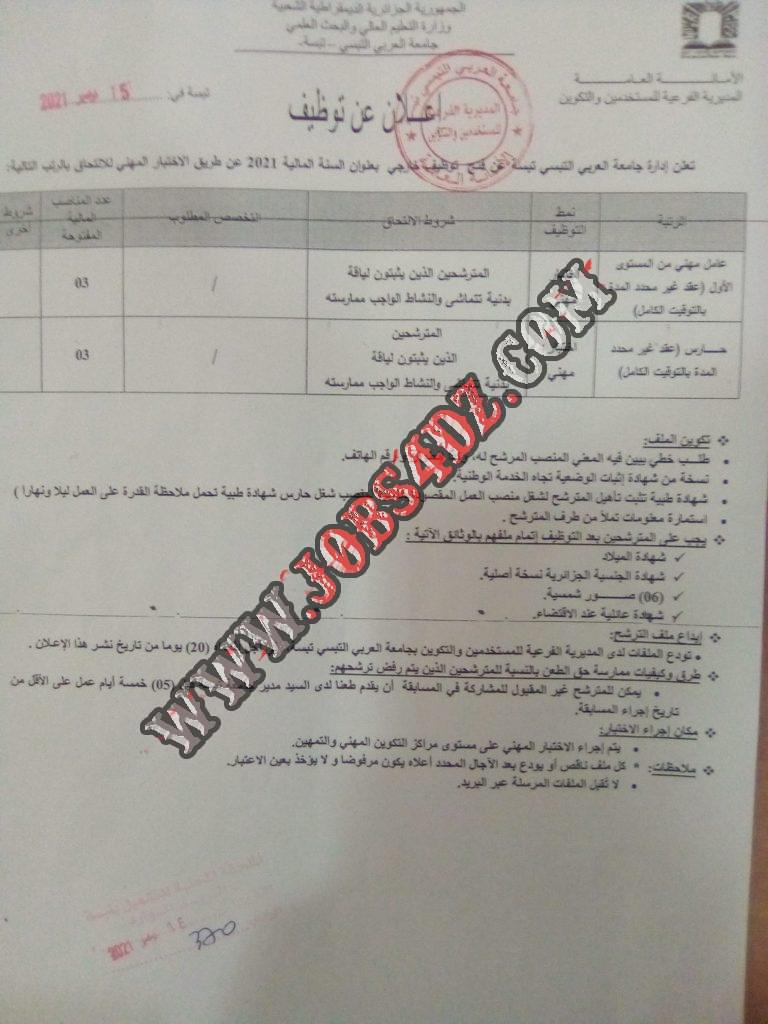 تعلن ادارة جامعة العربي التبسي تبسة عن فتح توظيف خارجي بعنوان السنة المالية 2021 عن طريق الاختبار المهني للالتحاق بالرتب التالية