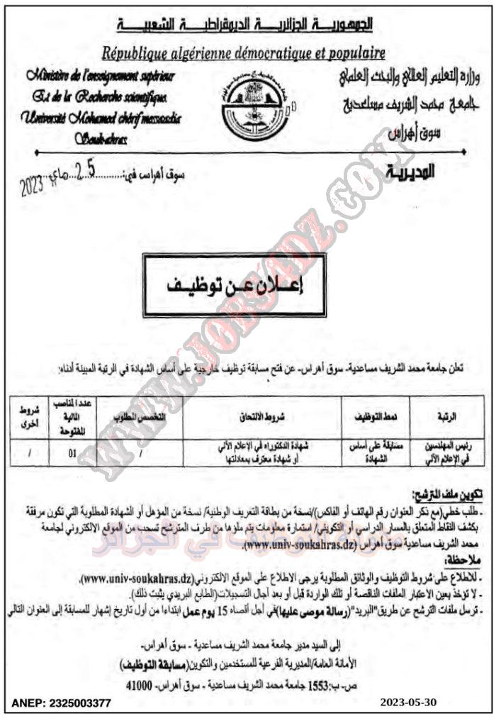 تعلن جامعة محمد الشريف مساعدية بولاية سوق اهراس عن فتح مسابقة توظيف على اساس الشهادة في المناصب المدرجة ادناه