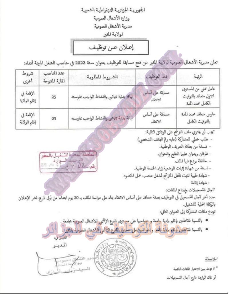 تعلن مديرية الاشغال العمومية لولاية المغير عن فتح مسابقة توظيف على اساس الانتقاء في الرتب المبينة ادناه