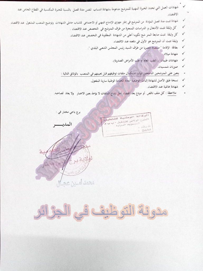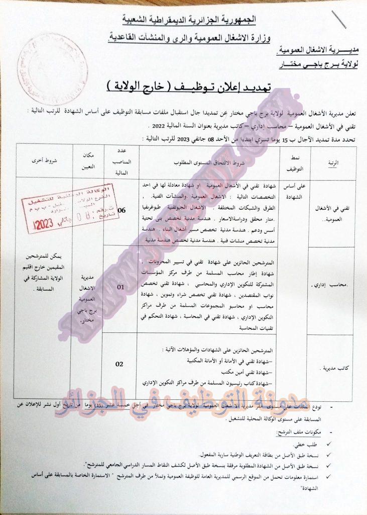 تعلن مديرية الاشغال العمومية لولاية برج باجي مختار عن فتح مسابقة توظيف على اساس الشهادة في الرتب المبينة ادناه