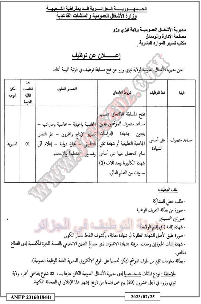 تعلن مديرية الاشغال العمومية لولاية تيزي وزو عن فتح مسابقة توظيف على اساس الشهادة في الرتب المبينة ادناه