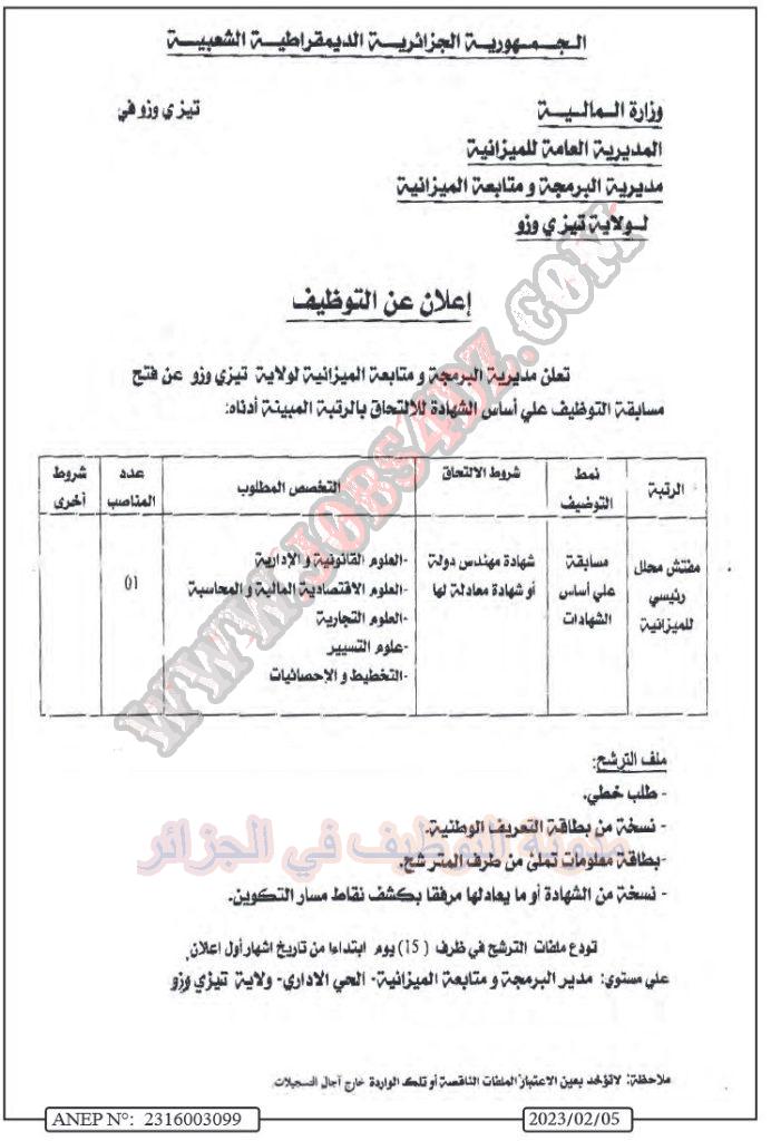 يعلن مديرية البرمجة ومتابعة الميزانية لولاية تيزي وزو عن فتح مسابقة توظيف على اساس الشهادة في الرتب المبينة ادناه
