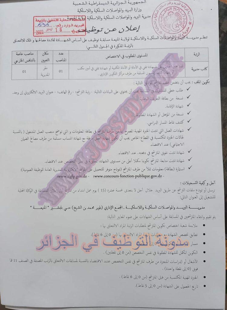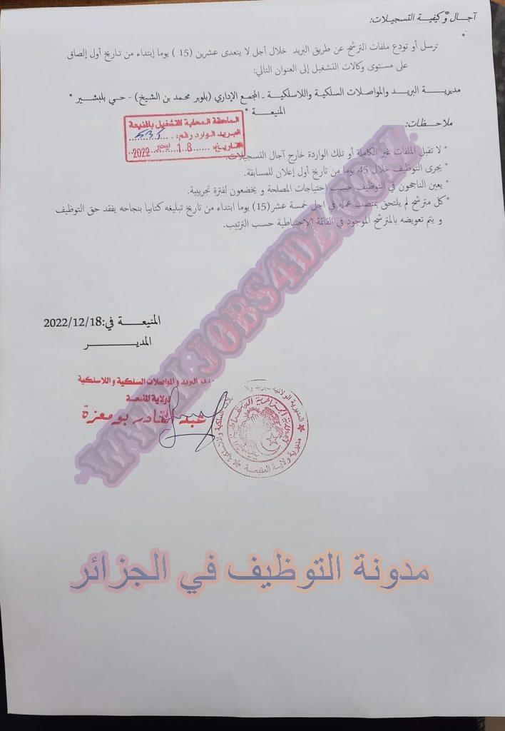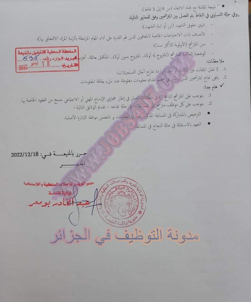 تعلن مديرية البريد والمواصلات السلكية واللاسلكية لولاية المنيعة عن فتح مسابقة توظيف على اساس الشهادة وعلى اساس الانتقاء في الرتب المبينة ادناه