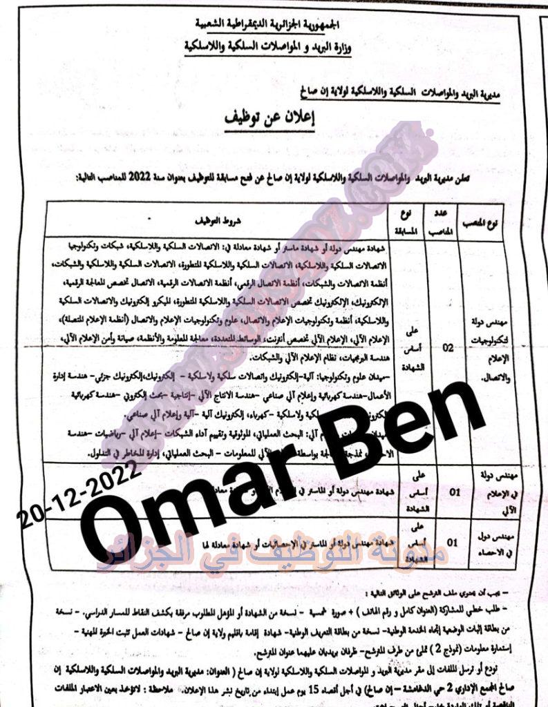 تعلن مديرية البريد والمواصلات السلكية واللاسلكية لولاية عين صالح عن فتح مسابقة توظيف على اساس الشهادة في الرتب المبينة ادناه