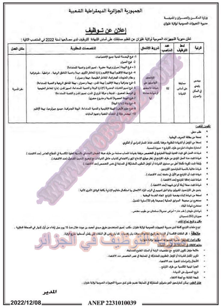 تعلن مديرية التجهيزات العمومية لولاية غليزان عن فتح توظيف على اساس الشهادة في الرتب المبينة ادناه