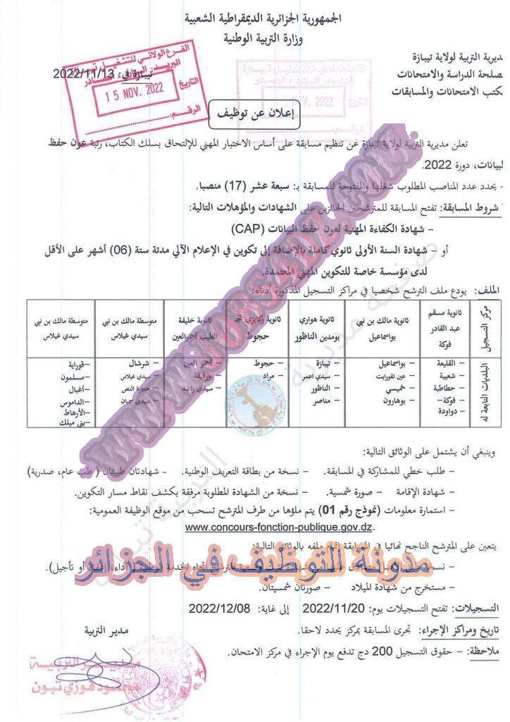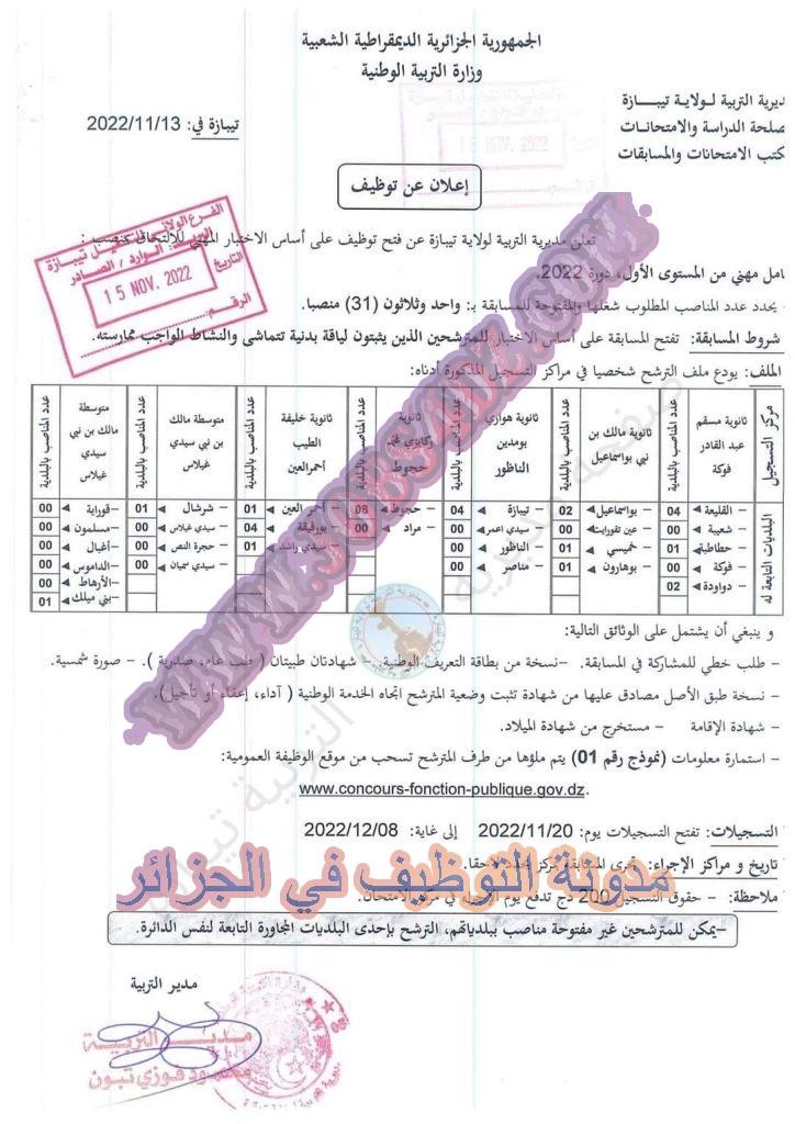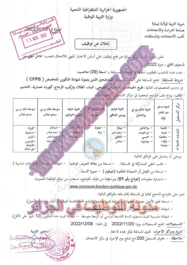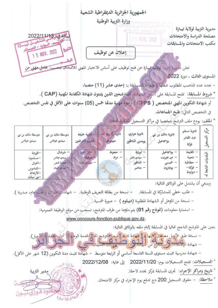 تعلن مديرية التربية لولاية تيبازة عن فتح مسابقات توظيف على اساس الشهادة الاختبار المهني في الرتب المبينة ادناه