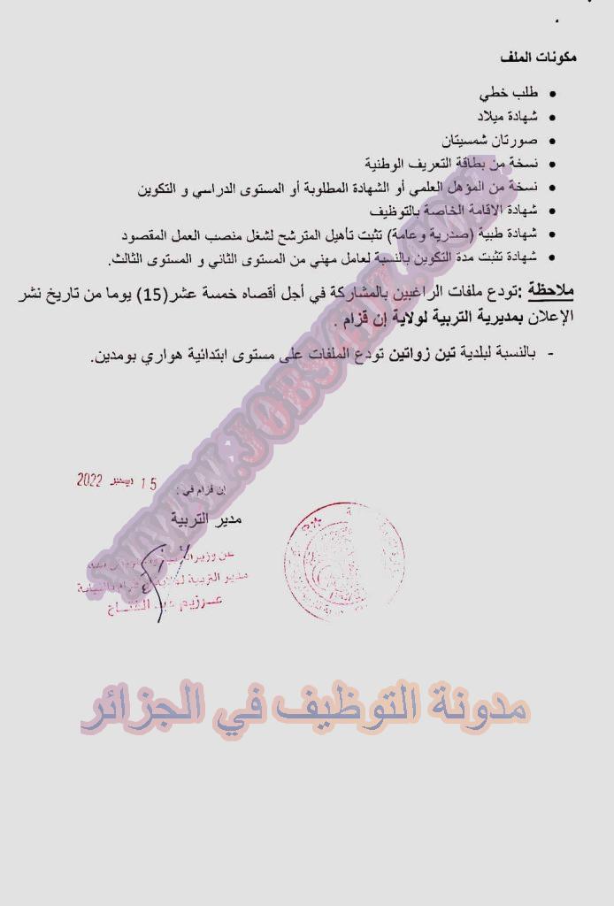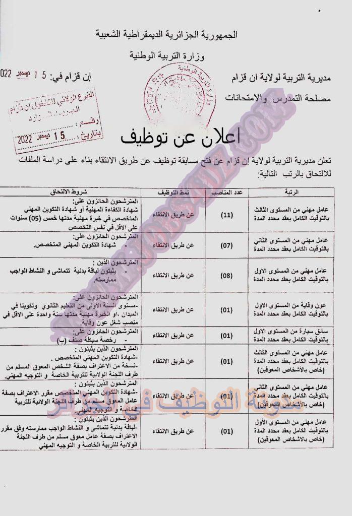 تعلن مديرية التربية لولاية عين قزام عن فتح مسابقة توظيف على اساس الانتقاء في الرتب المبينة ادناه