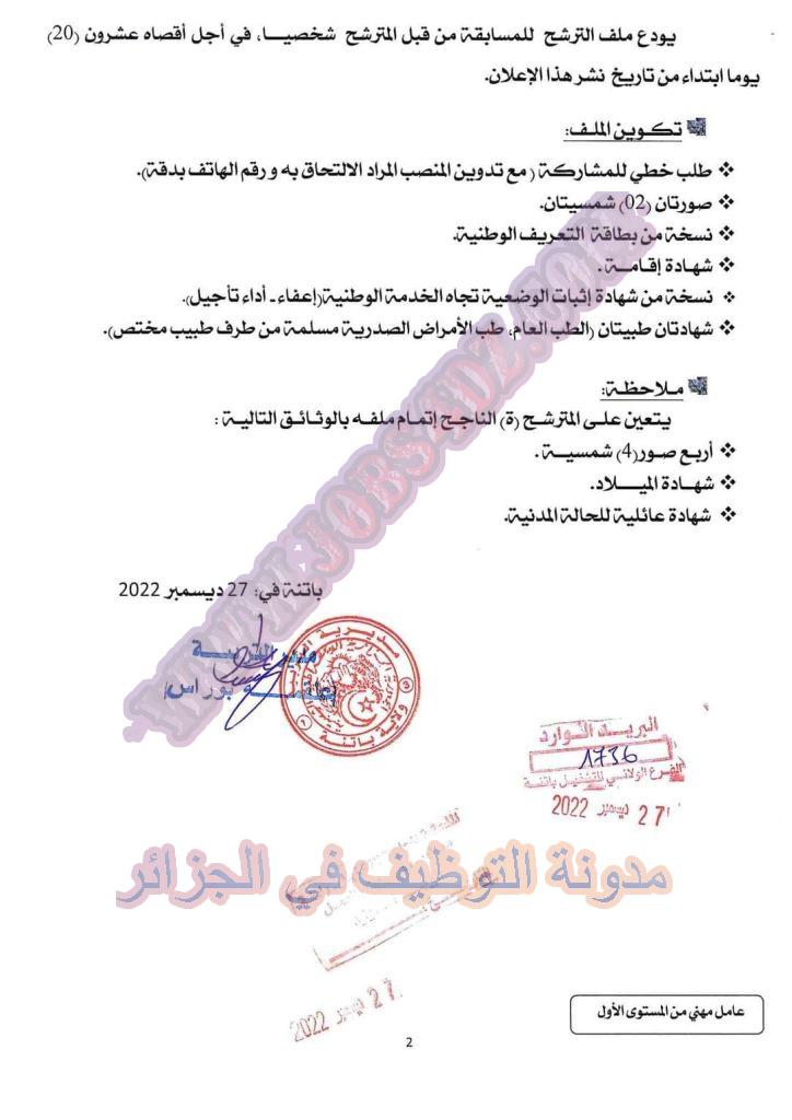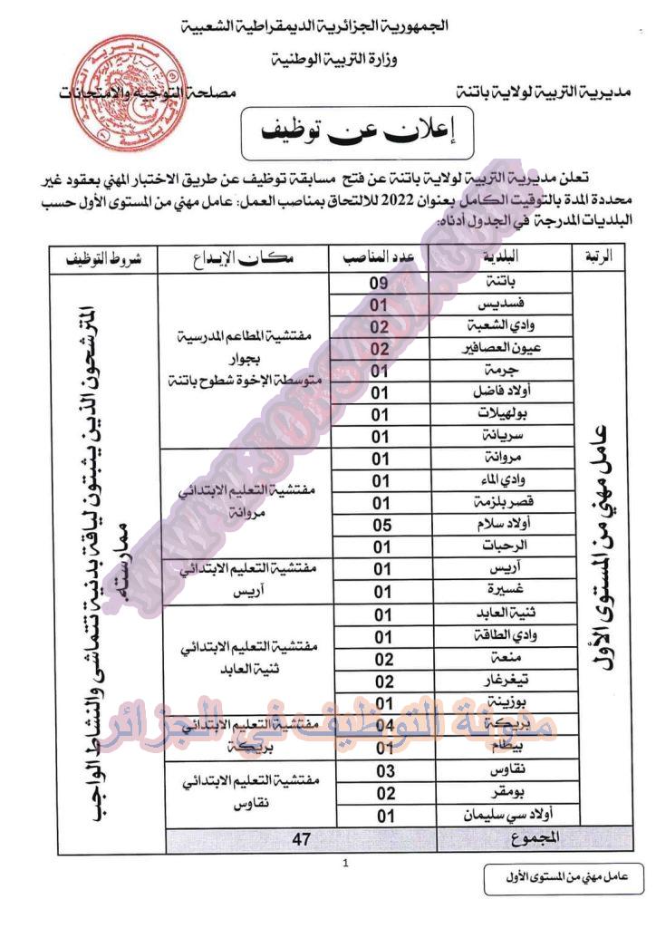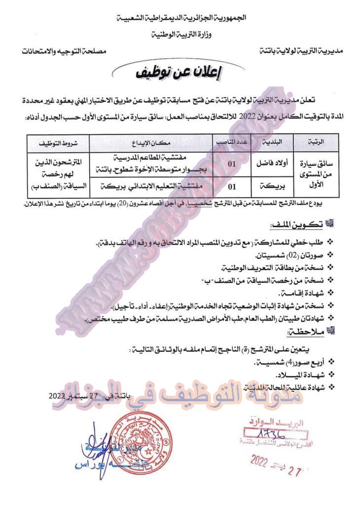 تعلن مديرية التربية لولاية باتنة عن فتح مسابقة توظيف على اساس الاختبار المهني في الرتب المبينة ادناه