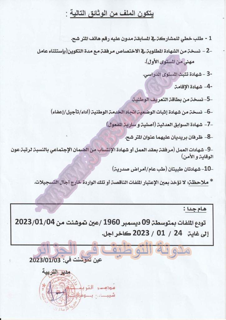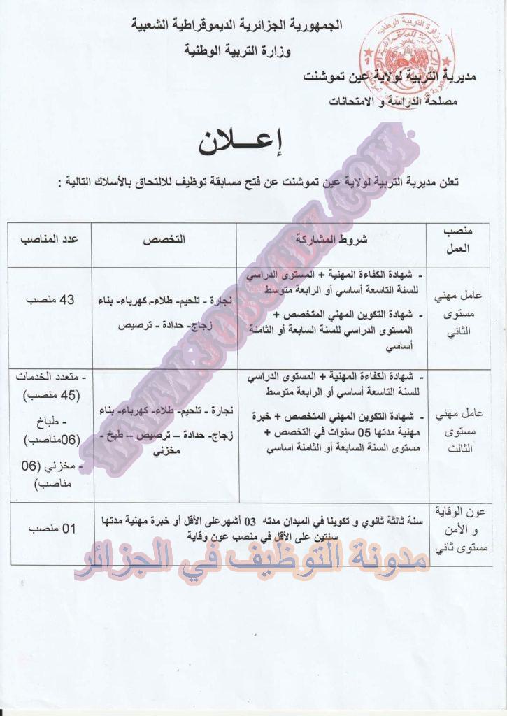 تعلن مديرية التربية لولاية عين تموشنت عن فتح مسابقة توظيف على اساس الاختبار المهني في الرتب المبينة ادناه