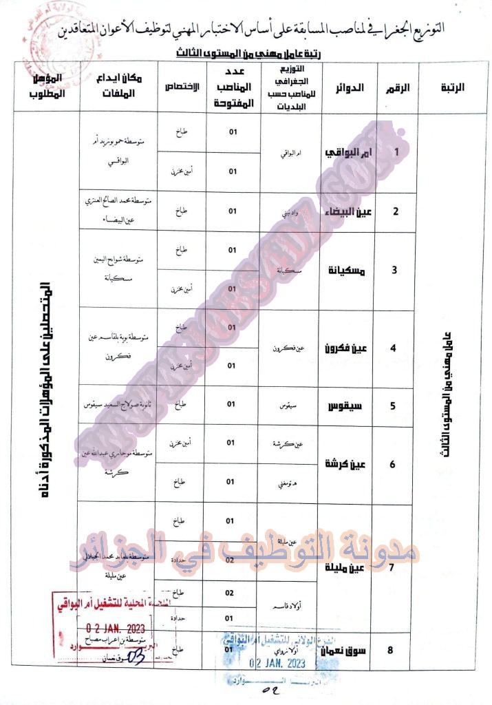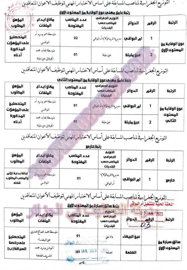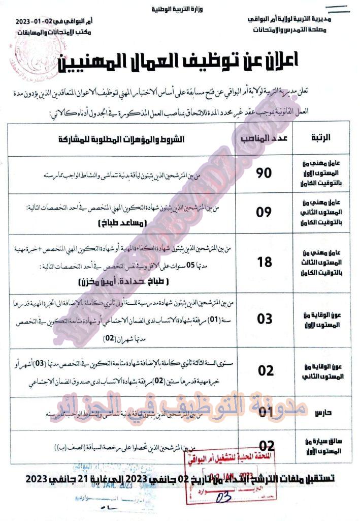 تعلن مديرية التربية لولاية ام البواقي عن فتح مسابقة توظيف على اساس الاختبار المهني في الرتب المبينة ادناه