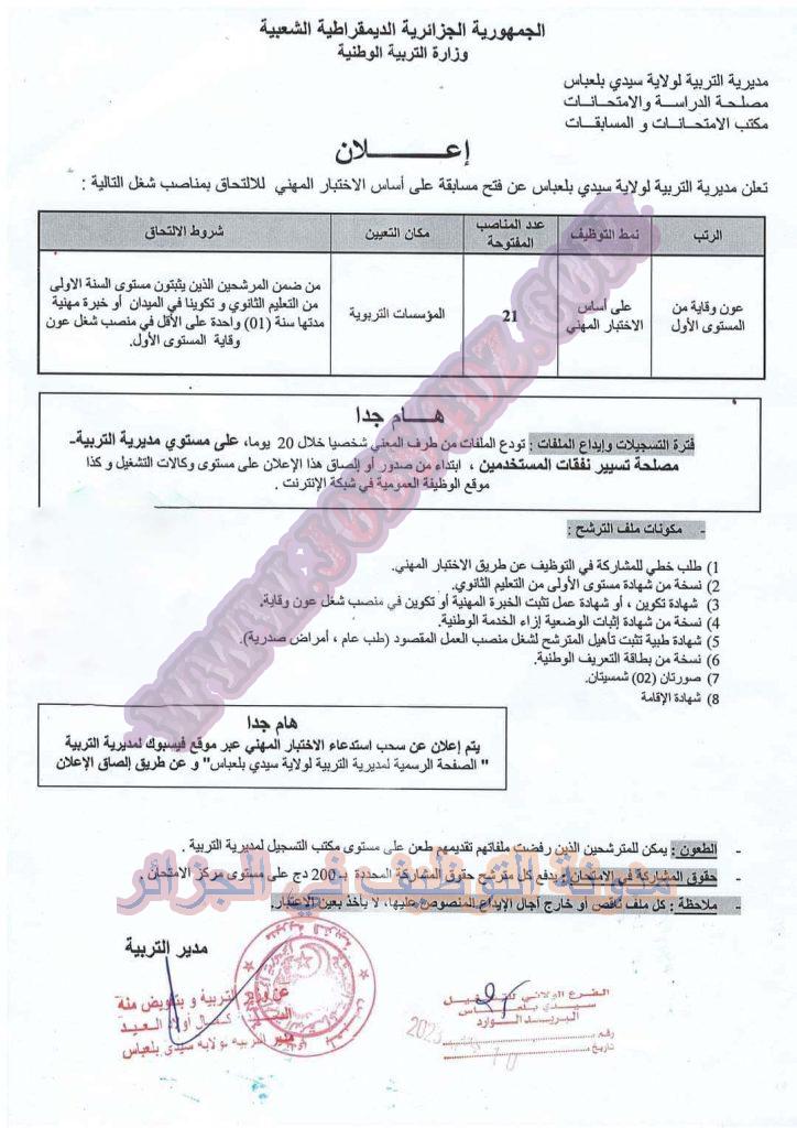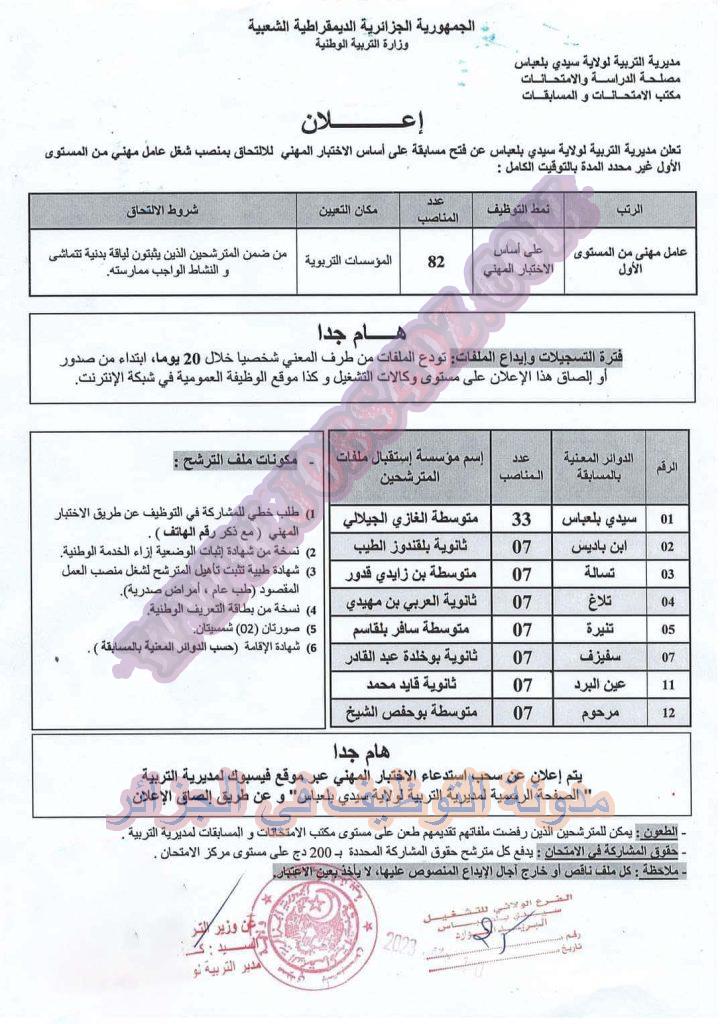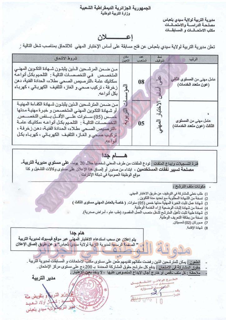 تعلن مديرية التربية لولاية سيدي بلعباس عن فتح مسابقة توظيف على اساس الاختبار المهني في الرتب المبينة ادناه