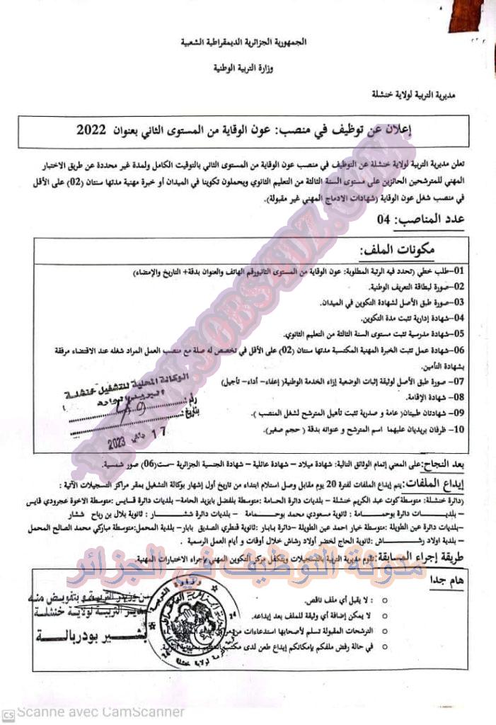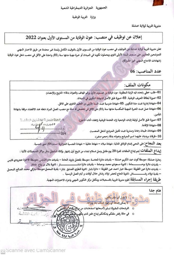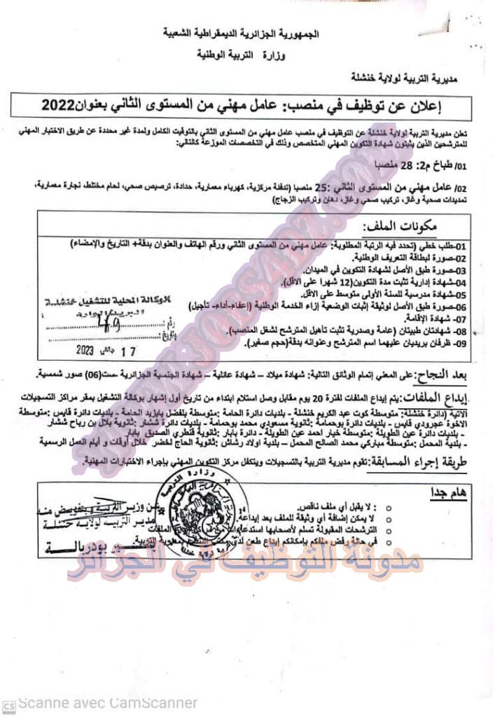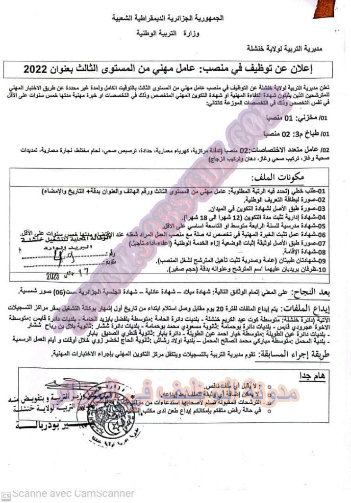 تعلن مديرية التربية لولاية خنشلة عن فتح مسابقة توظيف عن طريق الاختبار المهني في الرتب المبينة ادناه