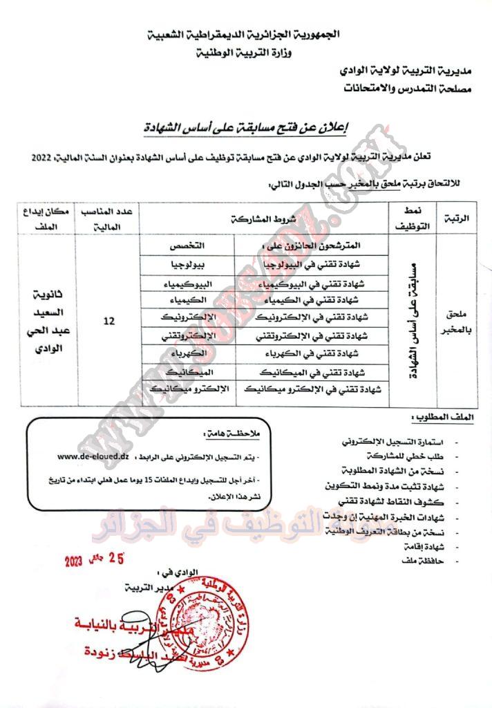 تعلن مديرية التربية لولاية الوادي عن فتح مسابقة توظيف على اساس الشهادة في الرتب المبينة ادناه