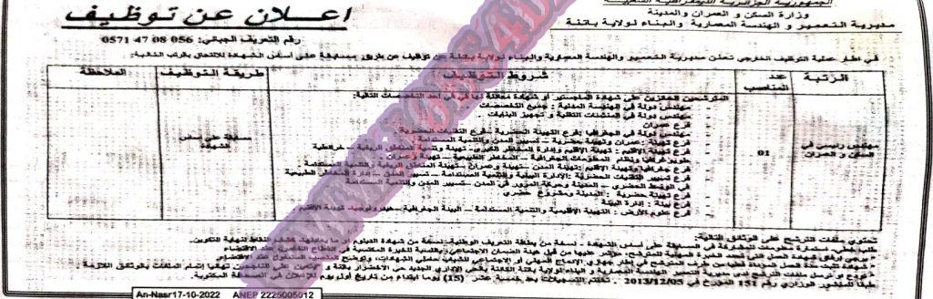 تعلن مديرية التعمير والهندسة المعمارية والبناء لولاية باتنة عن فتح توظيف على اساس الشهادات في الرتب المبينة ادناه