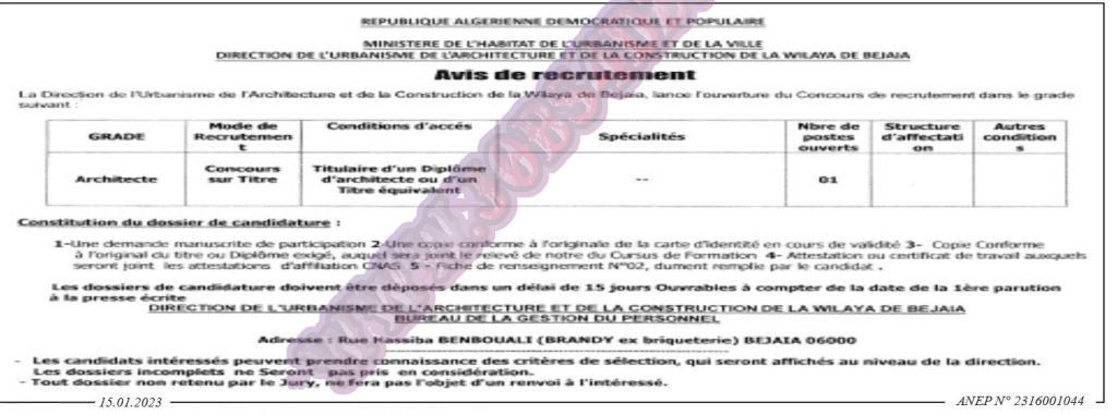 تعلن مديرية التعمير والهندسة المعمارية والبناء لولاية بجاية عن فتح مسابقة توظيف على اساس الشهادة في الرتب المبينة ادناه