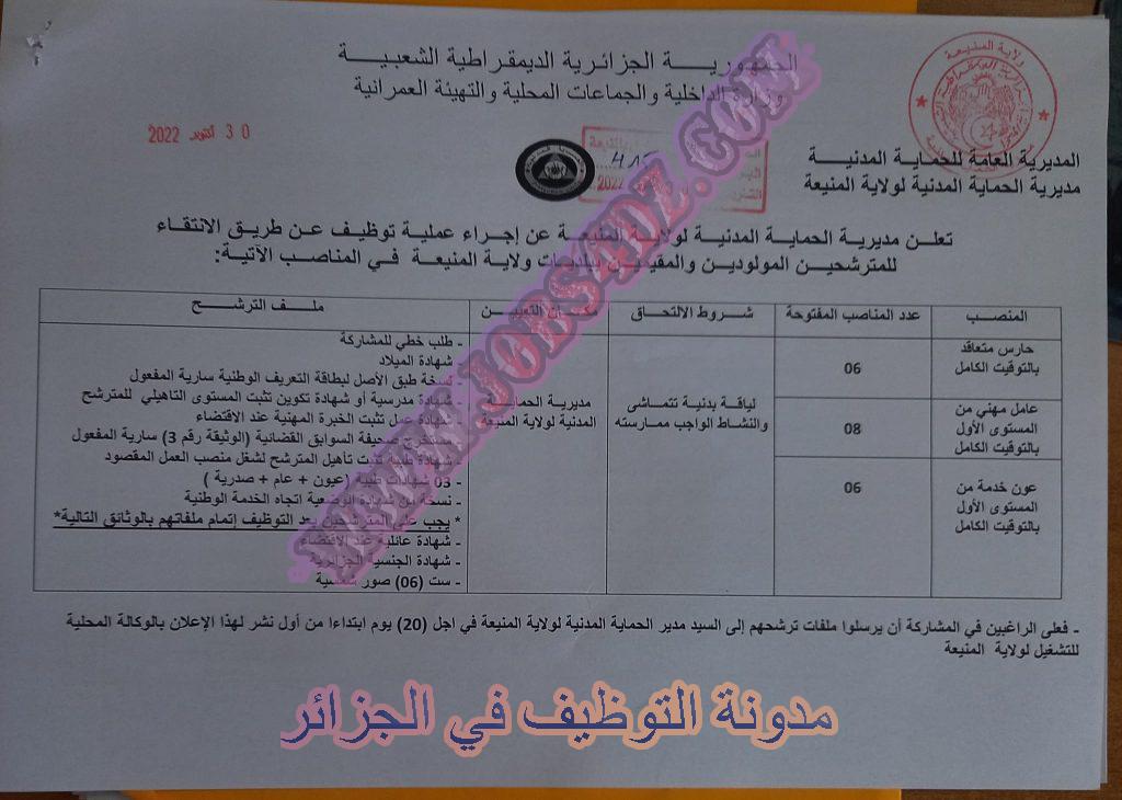 تعلن مديرية الحماية المدنية لولاية المنيعة عن فتح توظيف عن طريق الانتقاء في الرتب المبينة ادناه
