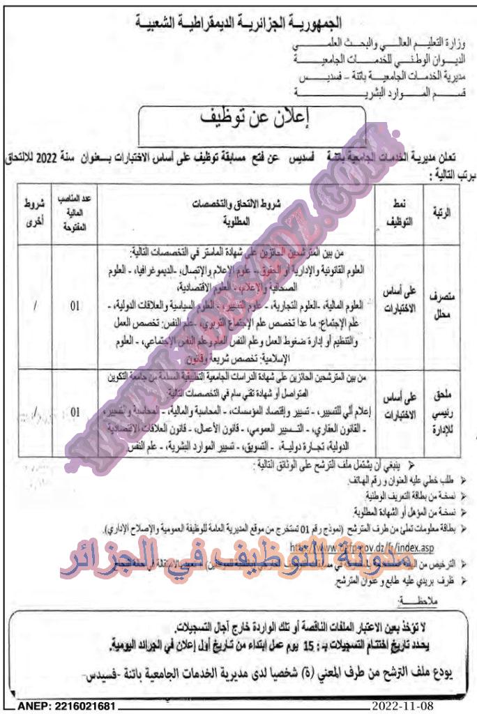 تعلن مديرية الخدمات الجامعية لولاية باتنة السديس عن فتح مسابقات توظيف على اساس الشهادة في الرتب المبينة ادناه