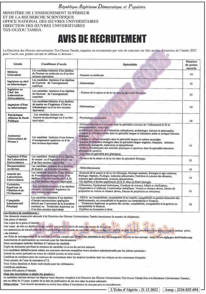 تعلن مديرية الخدمات الجامعية تيزي وزو تامدة عن فتح مسابقة توظيف على اساس الشهادة في الرتب المبينة ادناه
