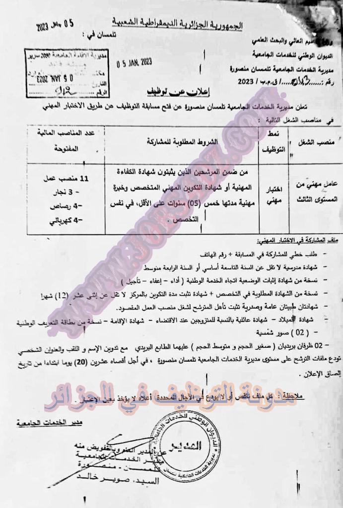 تعلن مديرية الخدمات الجامعية لولاية تلمسان عن فتح مسابقة توظيف عن طريق الاختبار المهني في الرتب المبينة ادناه