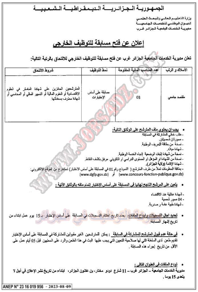 تعلن مديرية الخدمات الجامعية غرب عن فتح مسابقة توظيف على اساس الشهادة في الرتب المبينة ادناه