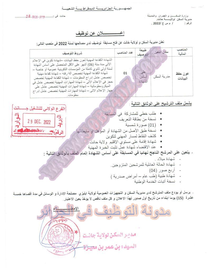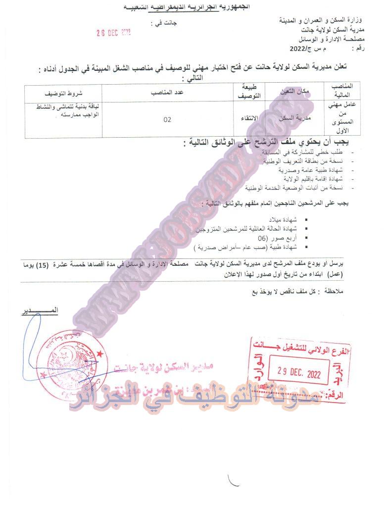 تعلن مديرية السكن لولاية جانت عن فتح مسابقة توظيف على اساس الشهادة والانتقاء في الرتب المبينة ادناه