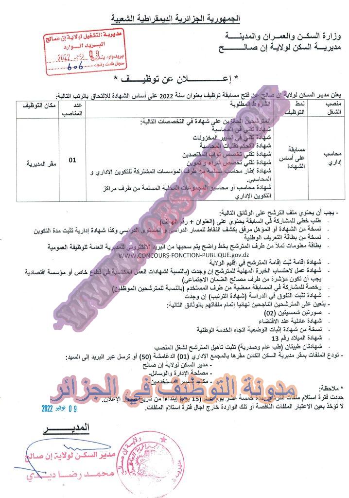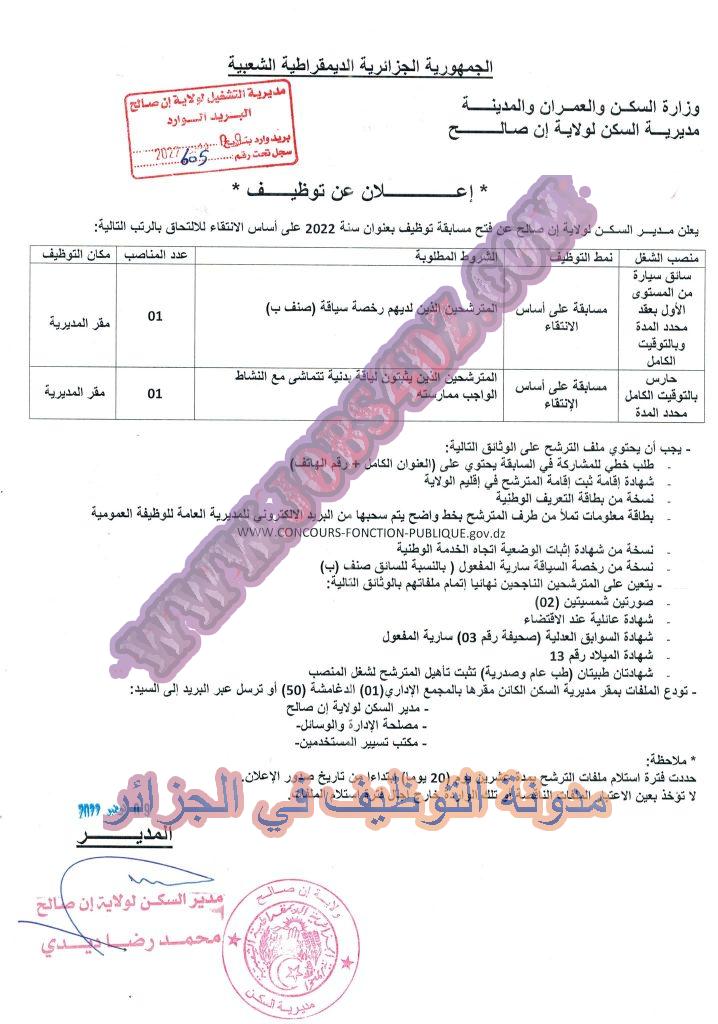 تعلن مديرية السكن لولاية عين صالح عن فتح مسابقات توظيف على اساس الشهادة وعلى اساس الانتقاء في الرتب المبينة ادناه