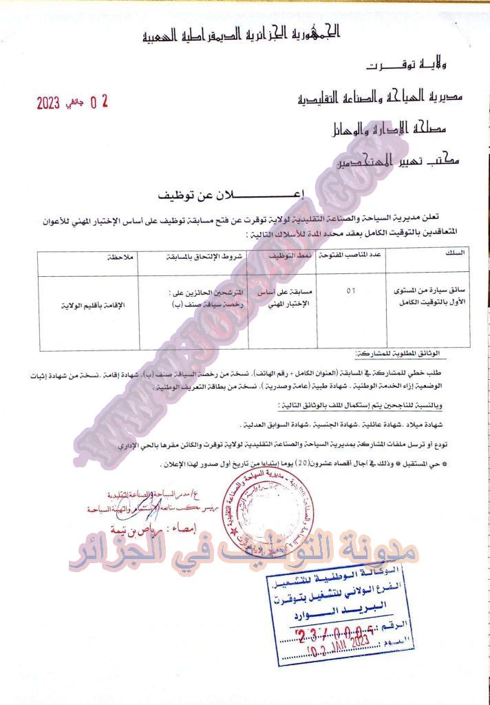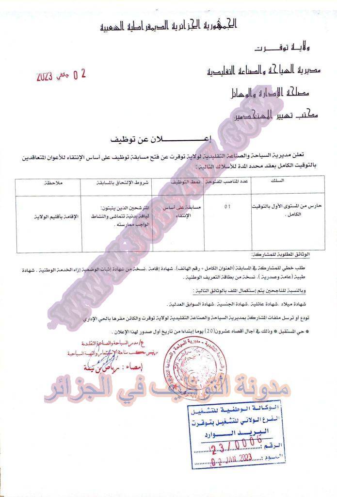 تعلن مديرية السياحة والصناعة التقليدية لولاية تقرت عن فتح مسابقة توظيف على اساس الشهادة في الرتب المبينة ادناه