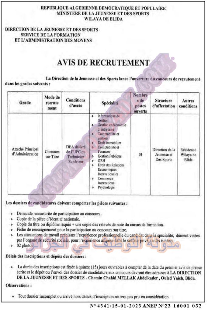 تعلن مديرية الشباب والرياضة لولاية البليدة عن فتح مسابقة توظيف على اساس الشهادة في الرتب المبينة ادناه