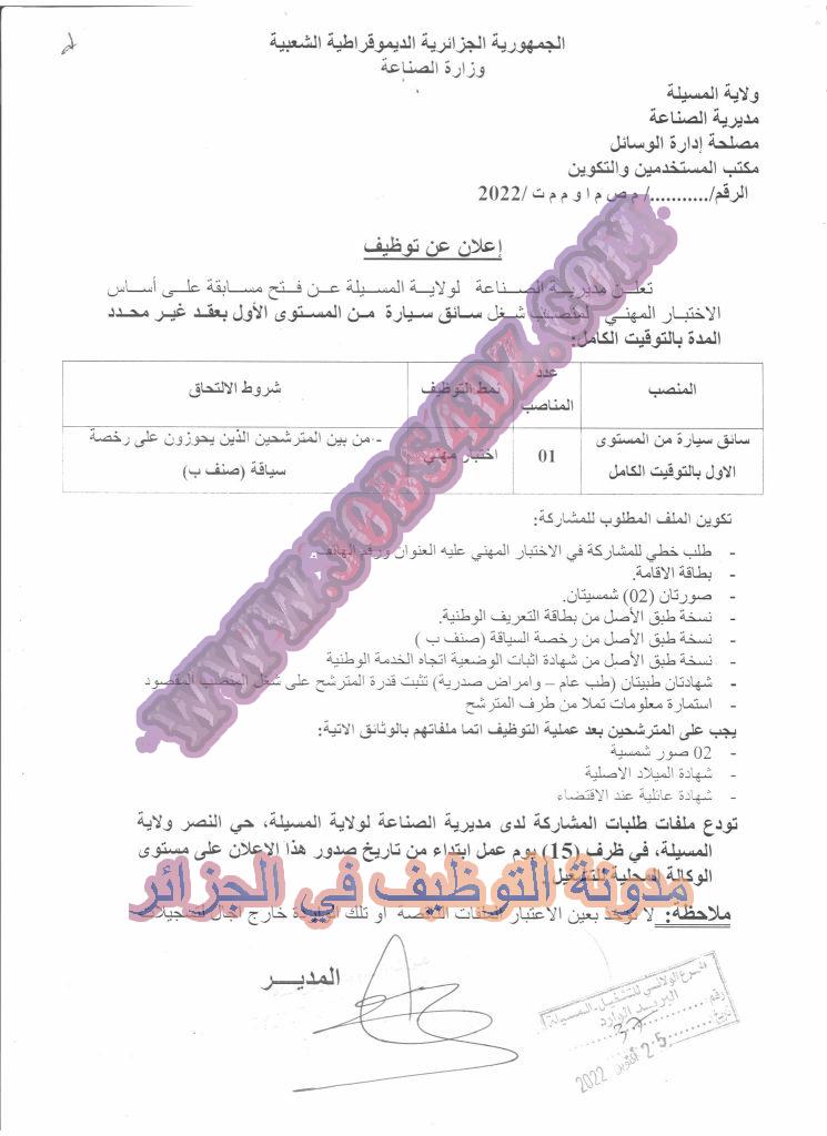 تعلن مديرية الصناعة لولاية المسيلة عن فتح توظيف على اساس الاختبار المهني في الرتب المبينة ادناه