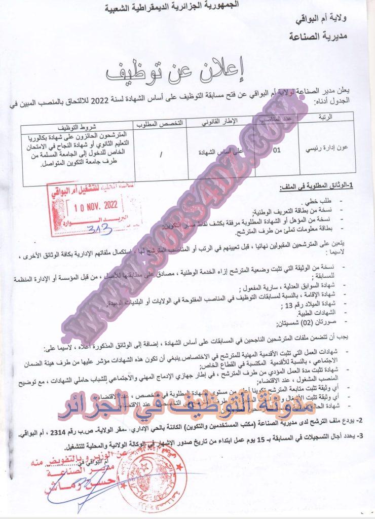 تعلن مديرية الصناعة لولاية ام البواقي عن فتح مسابقات توظيف على اساس الشهادة في الرتب المبينة ادناه