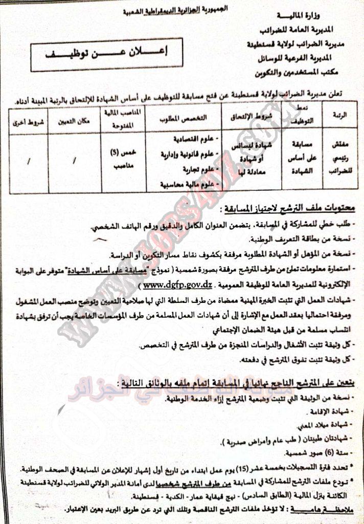 تعلن مديرية الضرائب بولاية قسنطينة عن فتح مسابقة توظيف على اساس الشهادة في الرتب المبينة ادناه