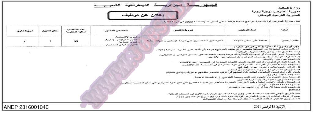 تعلن مديرية الضرائب لولاية بجاية عن فتح مسابقة توظيف على اساس الشهادة في الرتب المبينة ادناه