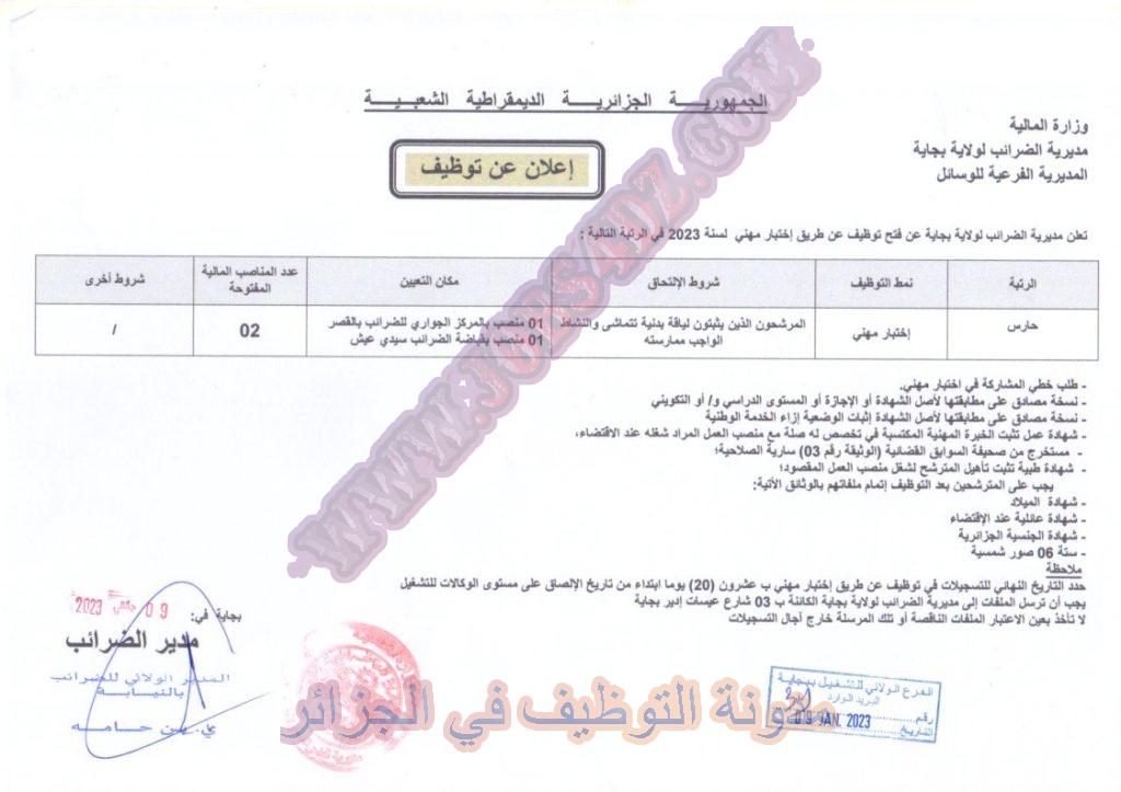 تعلن مديرية الضرائب لولاية بجاية عن فتح توظيف عن طريق الاختبار المهني في الرتب المبينة ادناه
