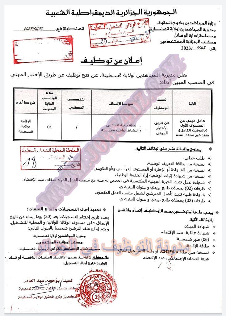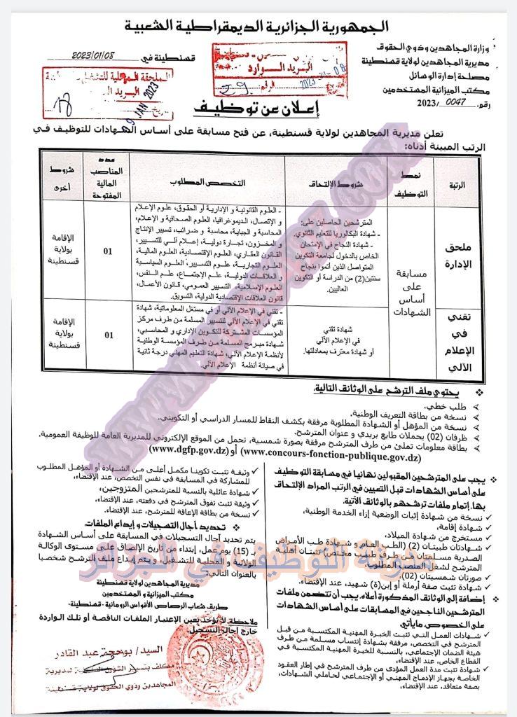 تعلن مديرية المجاهدين لولاية قسنطينة عن فتح مسابقة توظيف على اساس الشهادات وعلى اساس الاختبارات في الرتب المبينة ادناه