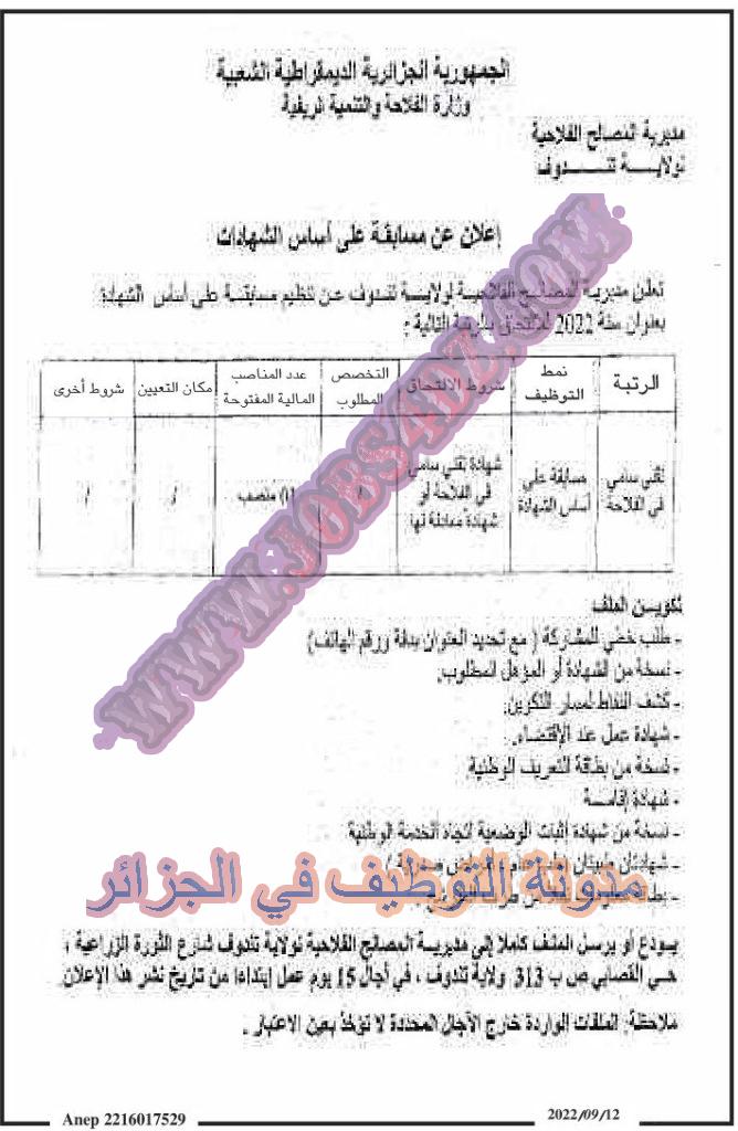 تعلن مديرية المصالح الفلاحية لولاية تندوف عن فتح مسابقة توظيف على اساس الشهادة في الرتب المبينة ادناه