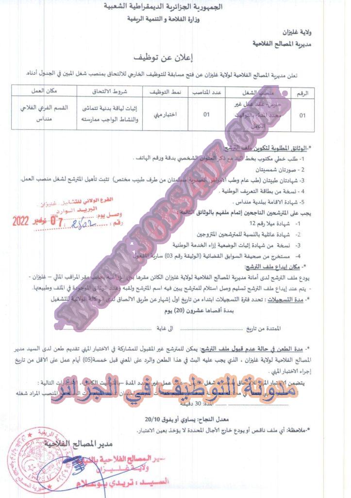 تعلن مديرية المصالح الفلاحية لولاية غليزان عن فتح توظيف خارجي عن طريق الاختبار المهني في الرتب المبينة ادناه