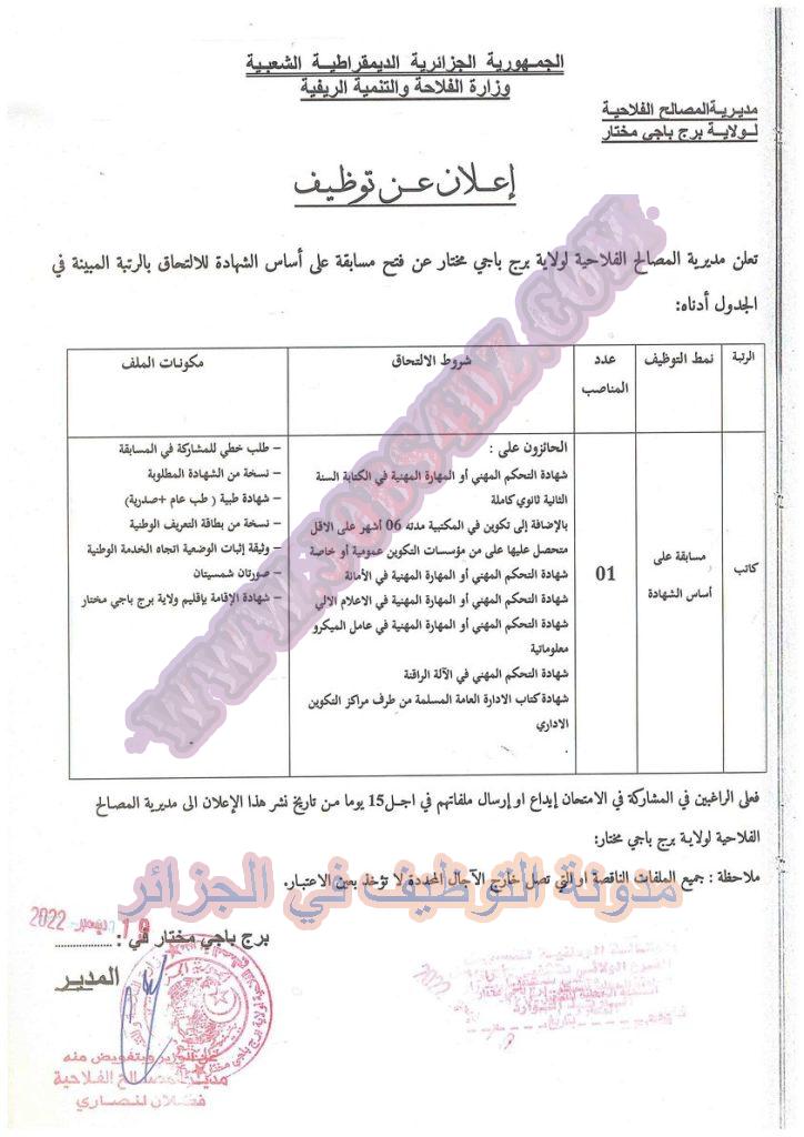 تعلن مديرية المصالح الفلاحية لولاية برج باجي مختار عن فتح مسابقة توظيف على اساس الشهادة في الرتب المبينة ادناه