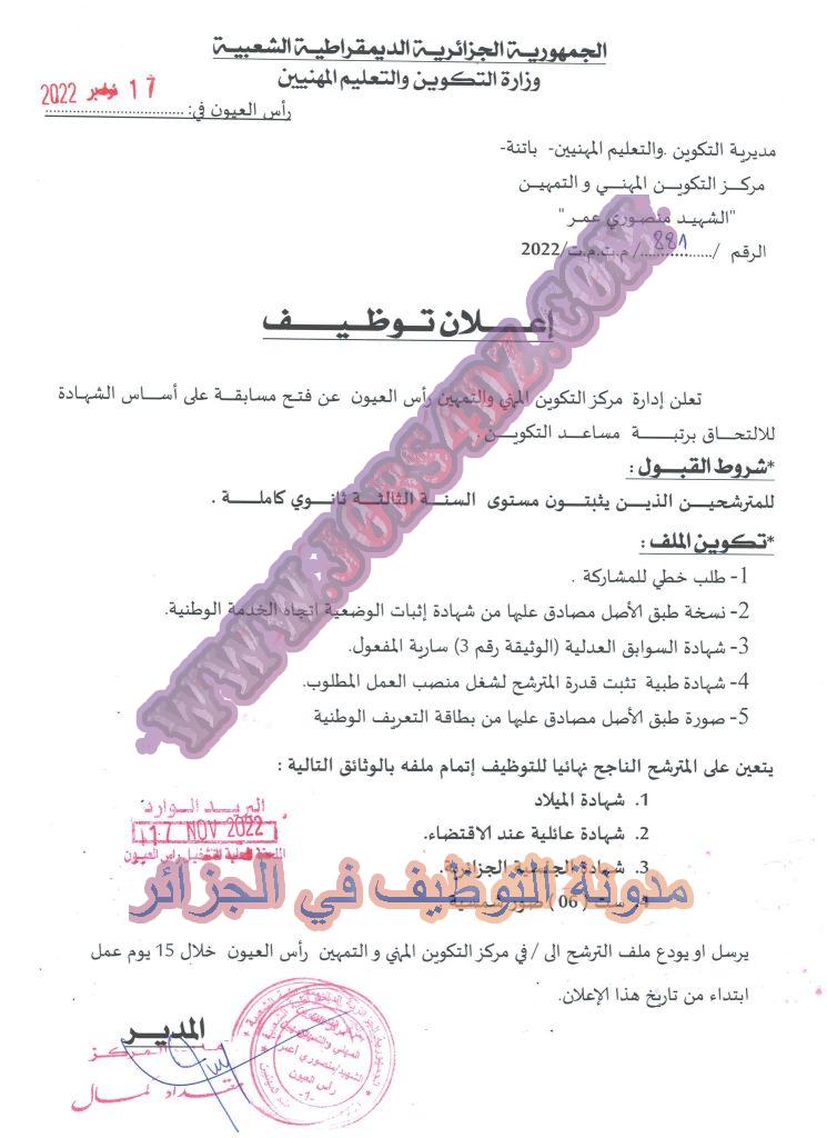 تعلن مركز التكوين المهني والتمهين راس العيون باتنة عن فتح مسابقات توظيف على اساس الشهادة في الرتب المبينة ادناه