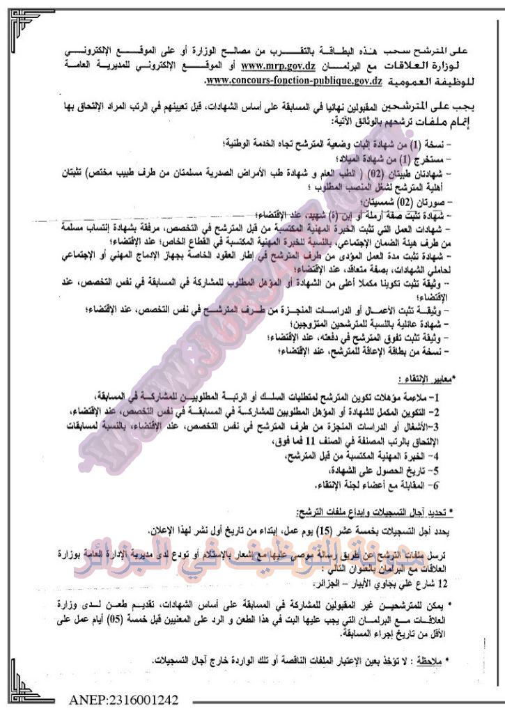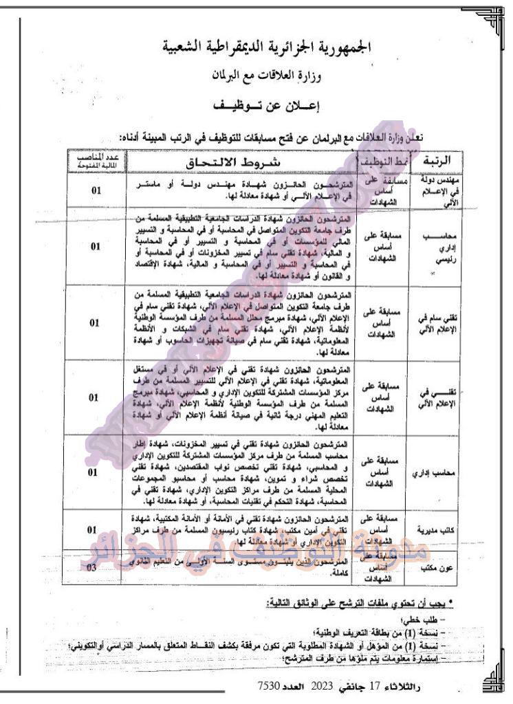تعلن وزارة العلاقات مع البرلمان عن فتح مسابقة توظيف على اساس الشهادة في الرتب المبينة ادناه