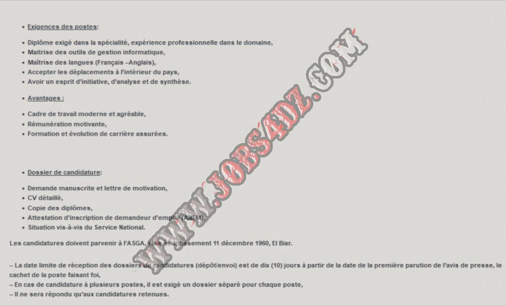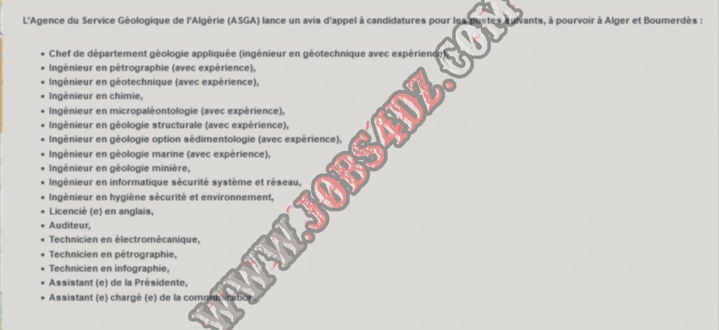تعلن وكالة المصلحة الجيولوجية الجزائرية (ASGA) عن طلب الترشحات للمناصب التالية ، التي سيتم شغلها في الجزائر وبومرداس: