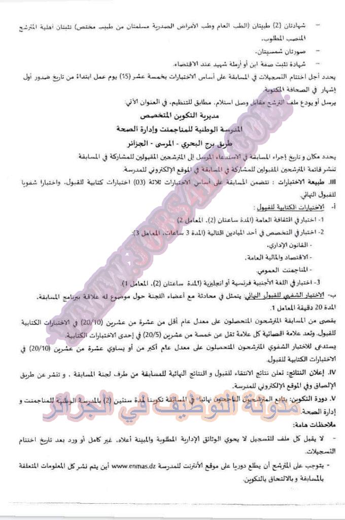 ترسل الملفات في العنوان التالي..مديرية التكوين المتخصص المدرسة الوطنية للمناجمنت وإدارة الصحة طريق برج البحري – المرسى – الجزائر في أجل لا يتجاوز 15 يوم من تاريخ نشر الاعلان