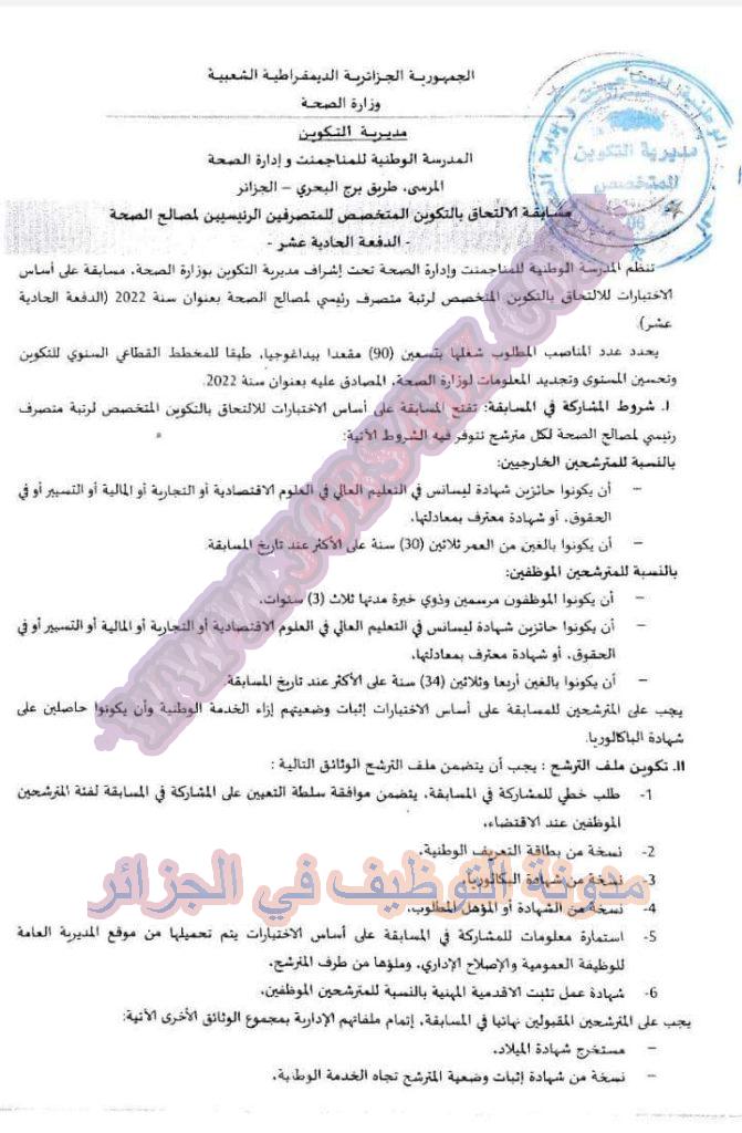 نعلن المدرسة الوطنية للمناجمنت وادارة الصحة عن فتح مسابقة على اساس الاختبارات للالتحاق بالتكوين المتخصص لرتبة متصرف رئيسي