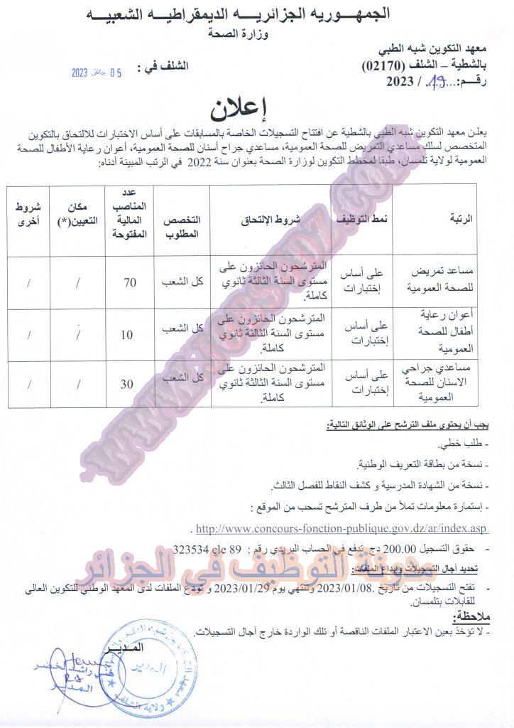 يعلن المعهد الوطني العالي شبه الطبي تلمسان عن افتتاح التسجيلات الخاصة بالمسابقات على اساس الاختبارات للالتحاق بالتكوين المتخصص لسلك مساعدي التمريض للصحة العمومية مساعدي جراحي الاسنان للصحة العمومية اعوان رعاية اطفال للصحة العمومية لولاية الشلف بعنوان سنة 2022 كما هو موضح ادناه