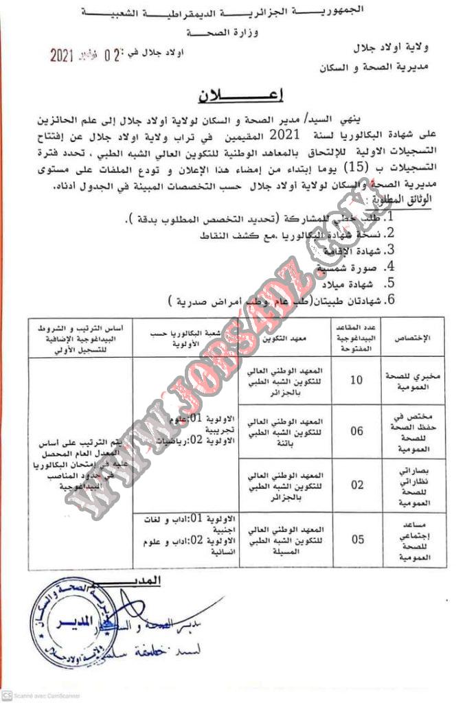 ينهي مدير الصحة لولاية اولاد جلال الى علم الحائزين على شهادة بكالوريا لسنة 2021 والكائن مقر اقامتهم بتراب ولاية اولاد جلال ،عن افتتاح التسجيلات الاولوية للالتحاق بمعاهد الوطنية للتكوين الشبه الطبي ،