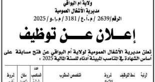 أكمل القراءة »إعلان عن توظيف بمديرية الأشغال العمومية لولاية أم البواقي