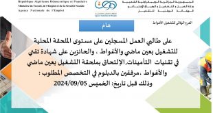 الجمهورية الجزائرية الديمقراطية الشعبية وزارة العمل والتشغيل والضمان الاجتماعي الوكالة الوطنية للتشغيل الفرع الولائي للتشغيل بالأغواط ads هام على طالبي العمل المسجلين على مستوى الملحقة المحلية للتشغيل بعين ماضي والأغواط، والحائزين على شهادة تقني في تقنيات التأمينات، الإلتحاق بملحقة التشغيل بعين ماضي والأغواط، مرفقين …