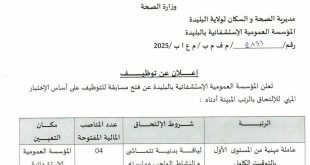 أكمل القراءة »إعلان عن توظيف بالمؤسسة العمومية الاستشفائية لولاية البليدة