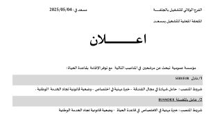 وزارة العمل و التشغيل و الضمان الاجتماعي الوكالة الوطنية للتشغيل الفرع الولائي للتشغيل بالجلفة الملحقة المحلية للتشغيل بالجلفة ads الجلفة في : 2025/04/29 إعلان مؤسسة عمومية تبحث عن مرشحين في المناصب التالية: دهان هياكل – Tôlier peintre – متطلبات المنصب: السن لا يتجاوز 35 …