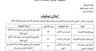 ولاية الجلفة دائرة: سيدي لعجال بلدية الخميس ads إعلان توظيف يعلن رئيس المجلس الشعبي البلدي لبلدية الخميس عن فتح مسابقة للتوظيف في الرتب كما هو مبين في التالي: الرتبة: عون للإدارة الإقليمية المترشحين الحائزين على مستوى السنة الثالثة ثانوي كاملة. عدد المناصب: 04 نمط …