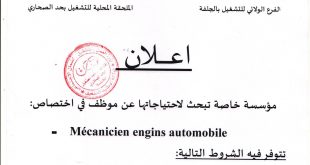 الجمهورية الجزائرية الديمقراطية الشعبية وزارة العمل والتشغيل والضمان الاجتماعي الوكالة الوطنية للتشغيل ads الفرع الولائي للتشغيل بالجلفة الملحقة المحلية للتشغيل بحد الصحاري إعلان مؤسسة خاصة تبحث لاحتياجاتها عن موظف في اختصاص: ميكانيكي محركات سيارات (Mécanicien engins automobile) تتوفر فيه الشروط التالية: شهادة ميكانيكي الخبرة …